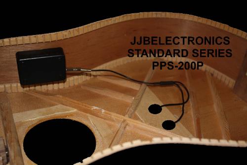 STANDARD SERIES PPS-200p RECOMMENDED USES NEW FROM JJB ELECTRONICS COMES THE PPS-200P ARE YOU LOOKING FOR A REPLACEMENT PICKUP FOR YOUR ON- BOARD PREAMP? ARE YOU PLANNING TO INSTALL A PREAMP AND DO NOT WANT TO MODIFY YOUR BRIDGE TO ACCOMODATE AND UNDER-SADDLE PICKUP? IF SO, THIS IS THE PERFECT SYSTEM FOR YOU. UNDER-SADDLE PICKUPS CANNOT COMPARE TO THE NATURAL SOUND REPRODUCTION THAT THESE OFFER! KEEP READING! These are built using very high quality 20mm piezo's. We can now offer to substitute these for 15mm piezo's upon request. Please email us after making your payment to specify that you would like 15mm transducers. This configuration is designed for guitars which do not provide enough space on the bridgeplate to allow for the bigger sized piezo's. Both systems have a very similar tone but the smaller system provides a little less output than the bigger sized system. In many cases this slight difference is negated by the higher resonance of a smaller bridgeplate. These can be used with or without a preamp with fantastic results. These are ideal if you desire a less defined bass and mid-range output. They are designed for more resonant guitars or ones with thinner soundboards. This system utilizes a dual piezo configuration for a crisp sound. The dual piezo configuration offers a few advantages over single piezo systems. Having two piezo’s affords you the opportunity to place them at two different points on the soundboard thus resulting in an improved dynamic range due to the fact that they transmit the resonation found at more than one point. These special surface transducers are under less pressure than under saddle pickups thus decreasing the likelihood of them transmitting a percussive or harsh sound. Each piezo is designed to pick up the resonation found in a significant amount of the soundboard. These do not "fade" or distort at high volume or with high-power systems. The highs are crystal clear while the lows are what they should be, low! They are very responsive. This particular system is fitted with a premium 2.5mm plug for easy connectivity to your existing on- board preamp. We have recently upgraded the build quality of this system, thus the reason for the slight price increase. Not to mention the ever-increasing costs associated with supplies and shipping, etc. It is the perfect replacement for your under-saddle pickup! This pickup configuration is offered in several high end guitars. All of our products feature quality components and construction. These will work great in a variety of instruments. Mandolins, ukulele’s, bass guitars, banjo’s, violins, dobro’s, dulcimers, stomp boxes, etc. The possibilities are endless! These, like all of our systems, can be installed in about 15 minutes! They are a very simple and inexpensive means of turning your acoustic instruments in to acoustic electric. Please don’t let the price fool you! PLEASE NOTE, WE CANNOT CONFIRM THAT THESE WILL WORK WITH WELL WITH EVERY PREAMP ON THE MARKET. THEY "SHOULD", BUT IT IS IMPOSSIBLE FOR US TO KNOW THE SPECIFICS OF EVERY PREAMP OUT THERE. THIS SYSTEM SHOULD BE SEEN AS A DIY SOLUTION FOR UNDER-SADDLE PIEZO REPLACEMENT. |