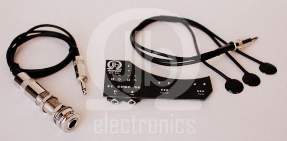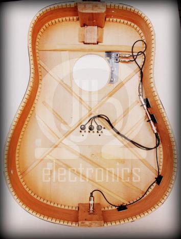 | ARTIST SERIES SHC-200 RECOMMENDED USES New from JJB-Electronics comes the SHC-200! We have been asked for the past few years when we were planning to offer a discreet soundhole mounted volume and tone control option. The wait is over! This system is great for people who would like these controls close at hand, but do not want to drill holes in their instrument to mount conventional potentiometers. We didn't compromise on this system one bit. Everything that went into it is the absolute best we could find, right down to the premium connectors. The board is a very high quality, double- layer design. This cuts down on the possibility of feedback or other unwanted harmonic noises. The control board is mounted to the soundboard using a very strong 3M double-stick material. It was very important to us while developing this system that there would be a retrofit option for people with existing JJB- ELECTRONICS systems installed. Please take a look at the pic on the right. No soldering is required to retrofit this system to your current one. Just plug in a few connectors and you're good to go! This option can be selected from the drop-down menu on the right. This system features 100% passive circuitry, because we firmly believe that batteries have no place inside of an acoustic instrument. This also helps to make it a very reliable system. These are built using very high quality 15 or 20mm transducers. Please select the desired size from the drop-down menu above. The 15mm configuration is designed for guitars which do not provide enough space on the bridgeplate to allow for the bigger sized piezo's. These are ideal for guitars with more mid-range and bass response. They are designed for more resonant guitars or ones with thinner soundboards..Both systems have a very similar tone but the smaller system provides a little less output than the bigger sized system. In many cases this slight difference is negated by the higher resonance of a smaller bridgeplate. The 20mm size is the best option for 12 string guitars as well as high-string setups. Either size can be used with or without a preamp with fantastic results. It utilizes a triple surface transducer design. This results in a very wide frequency range and very natural reproduction of sound. The three-piezo configuration offers a few advantages over single and double piezo systems. Having three piezo’s affords you the opportunity to place them at three different points on the soundboard thus resulting in an improved dynamic range due to the fact that they transmit the resonance found at more than one point. These special surface transducers are under less pressure than under saddle pickups thus decreasing the likelihood of them transmitting a percussive or harsh sound. Each piezo is designed to pick up a string pair as well as the resonance found in a significant amount of the soundboard. These do not fade or distort at high volume or with high-power systems. The highs are crystal clear while the lows are what they should be, low! This pickup configuration is offered in several high end guitars. All of our products feature quality components and construction. These utilize a premium quality Switchcraft 1/4” nickel plated stereo end-pin jack. This system will give you a very clean install for those who do not want to compromise the integrity of their beloved instrument. The end-pin jack also doubles as a strap button. These, like all of our systems, can be installed in about 15 minutes! They are a very simple and inexpensive means of turning your acoustic instruments in to acoustic electric. |