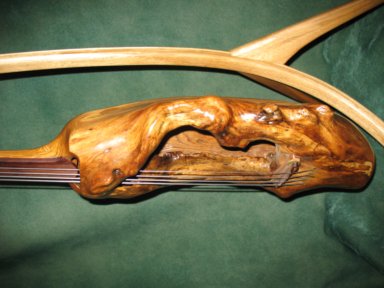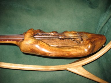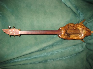 | This is my first guitar project, a fretless accoustic/electric bass. I am very happy with the way it turned out, considering it's function-follows-form design. All conventional accoustic theories were ignored. It sounds ok in the living room unplugged, but realy comes alive when hooked up to a good amp. Thanks to jjb's pickups I can work with the shape of the natural wood and still have great sound quality. My next project is a six-string guitar. It's coming right along and will be powered by a jjb triple pickup. More pics when finished. |