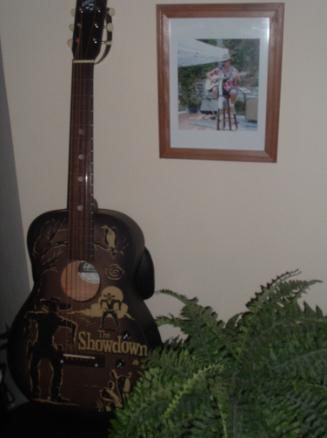 | I decided to mod my Americana "The Showdown" today by installing dual sound transducers with a volume and tone control. Took me all of about five minutes to drill the holes and install the electronics. Note the volume and tone controls above and below the word "Showdown". The pickup was a great eBay find "Made in the USA" dual sound transducer set with volume and tone controls from www.jjb-electronics.com for $29.95. So here is the deal $28.99 for the guitar from Overstock.com and $29.95 for the pickup!. My own little Gretsch Americana "Sundown" Acoustic Electric for less than $60! |
